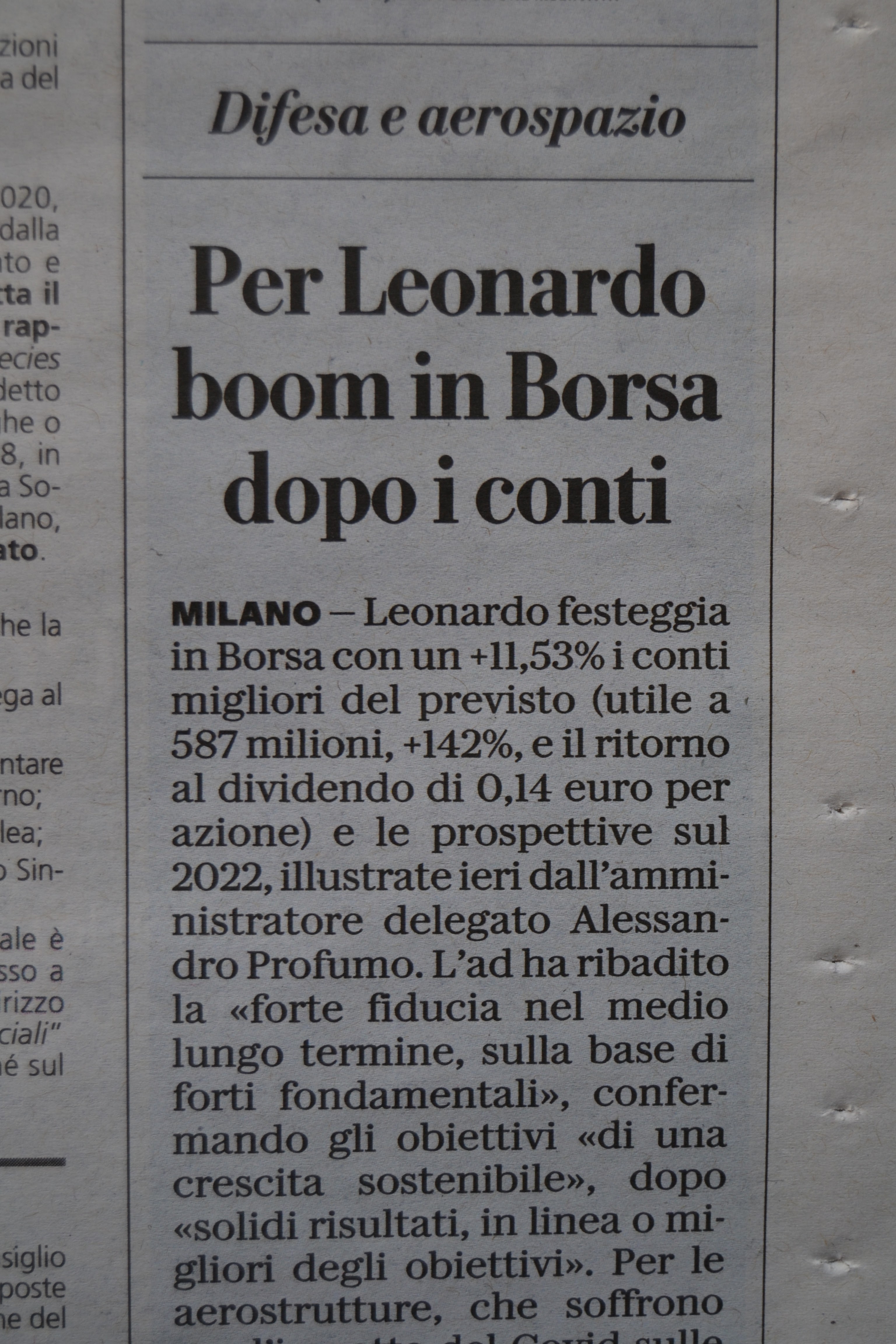 | Ancora su la Repubblica, nella pagina di Economia: "Per Leonardo boom in Borsa" (12 marzo 2022) Nel mondo in guerra soffrono i popoli e guadagnano i produttori di armi ... |